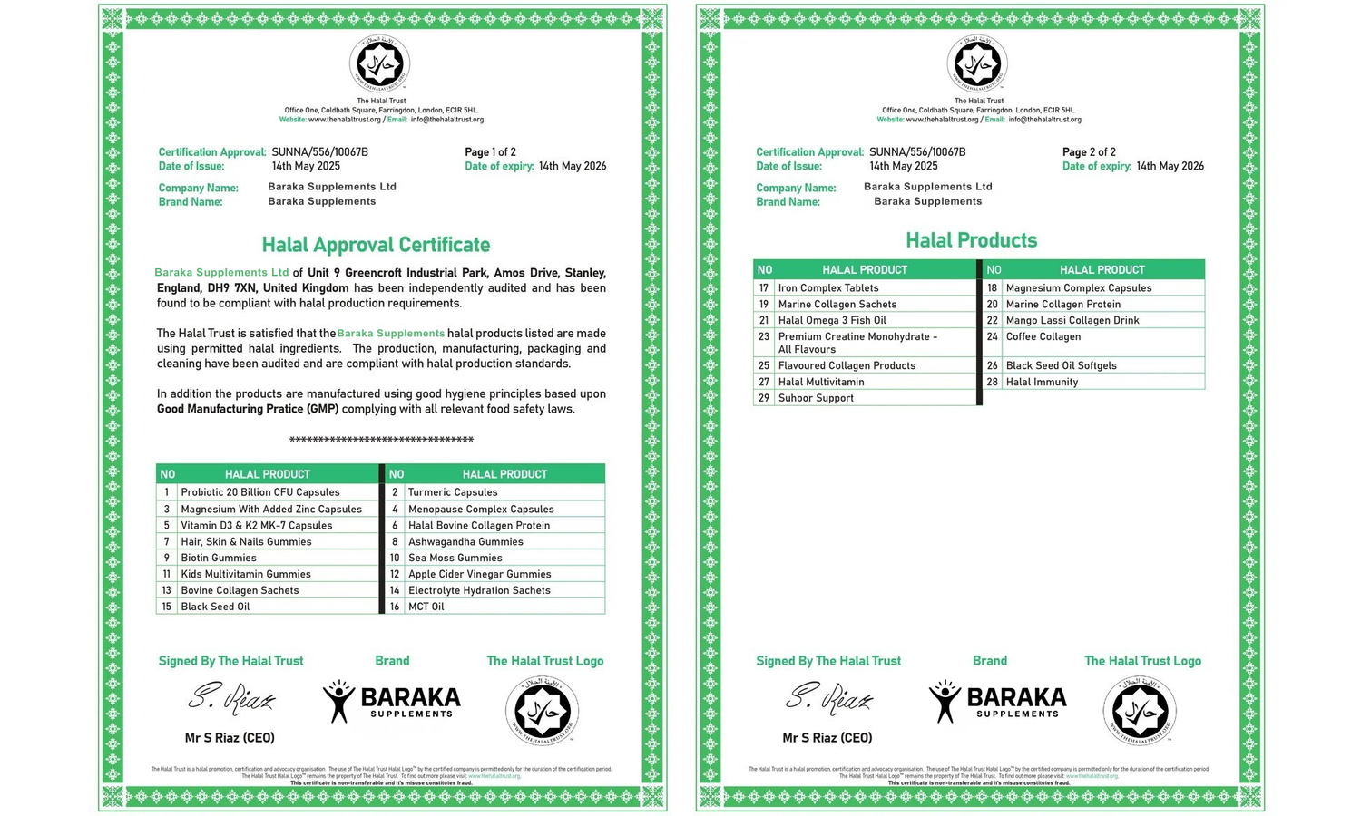 Baraka Supplements est officiellement certifié halal par The Halal Trust (UK),