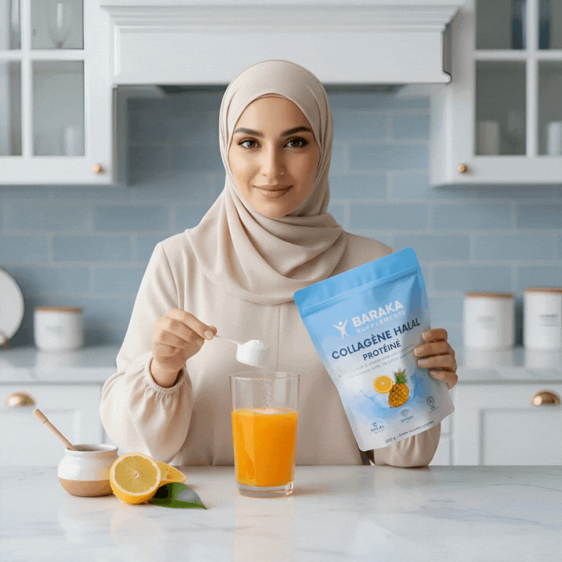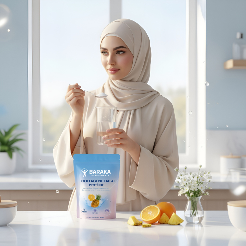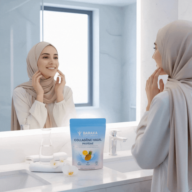 Chez Baraka Supplements, nous avons créé le premier collagène 100 % halal, pour celles et ceux qui veulent prendre soin de leur peau, de leurs cheveux et de leurs articulations, sans jamais faire de compromis avec leurs valeurs.